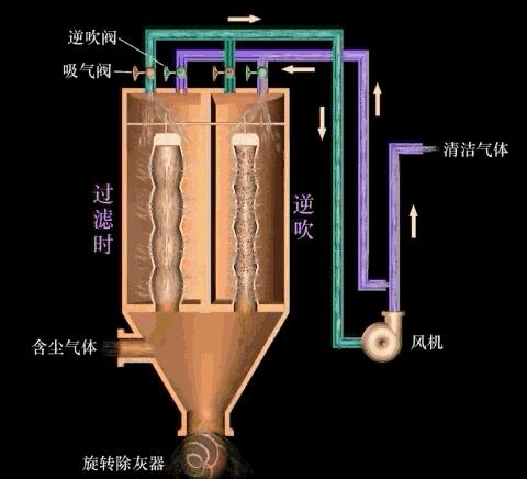 一、過濾式除塵器 袋式除塵器的形式、種類很多,按清灰方式可以分為機(jī)械清灰、逆氣流清灰、脈沖噴吹清灰三類; 按過濾方式可以分為內(nèi)過濾式和外過濾式兩類;按進(jìn)出口的位置不同可分為下進(jìn)風(fēng)和上進(jìn)風(fēng)兩類。 1、袋式除塵器 逆氣流清灰是采用室外或循環(huán)空氣形式與含塵氣流相反的反方向氣流通過濾袋,使其上的塵層脫落,掉入灰斗中。 在這種清灰方式中,一方面是由于反方向的清灰氣流在粉塵層上形成的黏性剝離力直接剝離塵層;另一方面,由于氣流方向的改變,濾袋產(chǎn)生脹縮振動(dòng),也有助于塵塊的脫落。